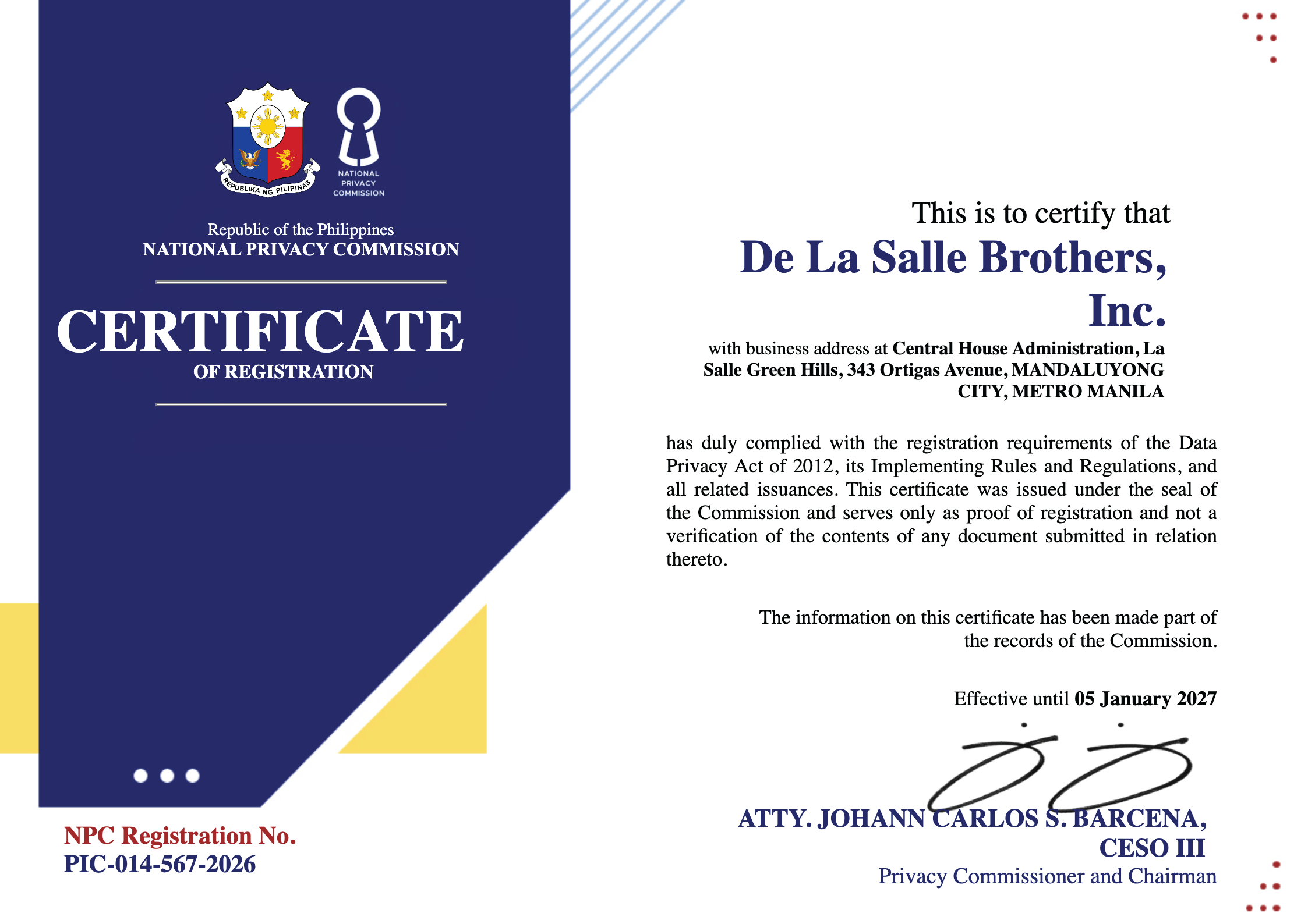 We employ security measures to protect your personal data and share it only with authorized third parties when required by law or for legitimate purposes. For any privacy-related inquiries, please contact our Data Protection Officer at dpo@delasalle.ph.